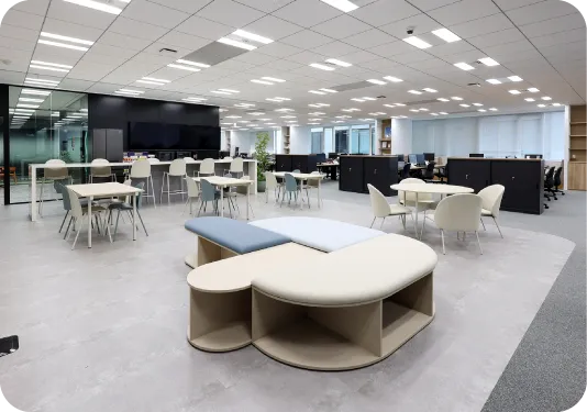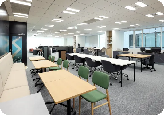 入社2年目から目標設定をするのですが、今後の希望等を伝えることで、自身のやりたいことに近づくためにはどうしたら良いかのアドバイスがいただけます。作業環境としては、当社オフィスが綺麗です。特にソリューションセンター(きたらぼ)は2025年3月に移転して、オープンな小会議スペースやWEB会議が可能なスペースなど会議室が充実しています。
